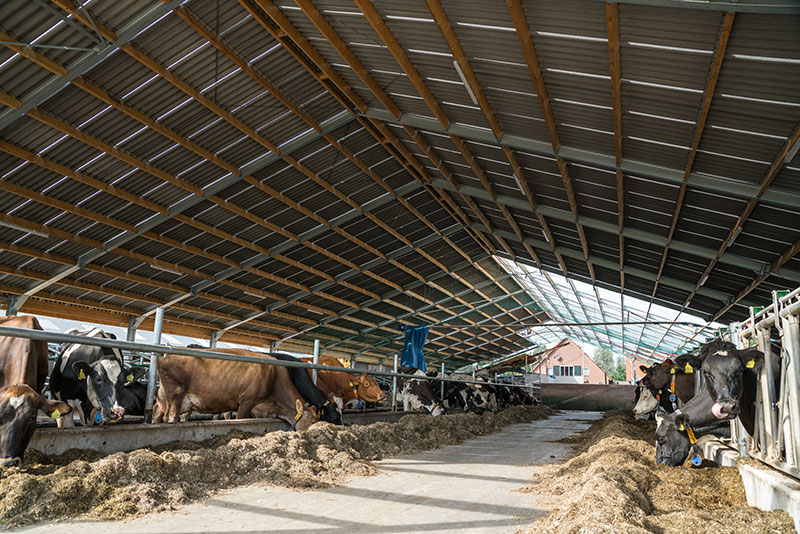 Bovendien kunnen de golfplaten uitgevoerd worden met isolatie en lichtdoorlatende golfplaten. In een stal is voldoende daglicht essentieel. Het is goed voor de productie én heeft een positieve invloed op het gedrag en vruchtbaarheid van de dieren. Transparante lichtplaten in combinatie met kunstlicht zijn daarom de beste oplossing. Deze zorgen voor aangenaam daglicht. Eternit golfplaten geven veel positioneringsvrijheid: af en toe één lichtplaat integreren of werken met volledige lichtstraten? Het is allemaal perfect mogelijk.